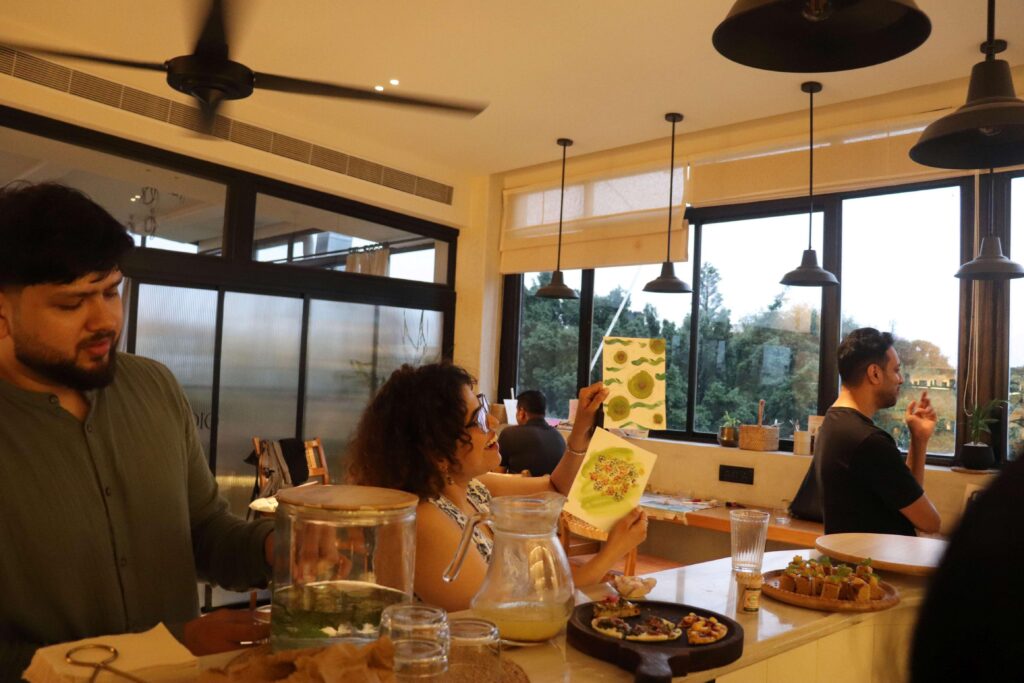 But the art table- that was where silence became a language of its own. Impression art using leaves, paint, textures, and bits of nature. Each person created a world on paper, and no two worlds looked alike. “I forgot I could do this,” whispered a woman dabbing gold paint onto a eucalyptus leaf. Another confessed, “I’ve been doing digital art on my iPad for years, but working with real leaves… real paint… it’s something else. My hands feel involved. My mind feels awake.” Someone else added, with a soft laugh, “I didn’t know how much I missed painting until now.”
